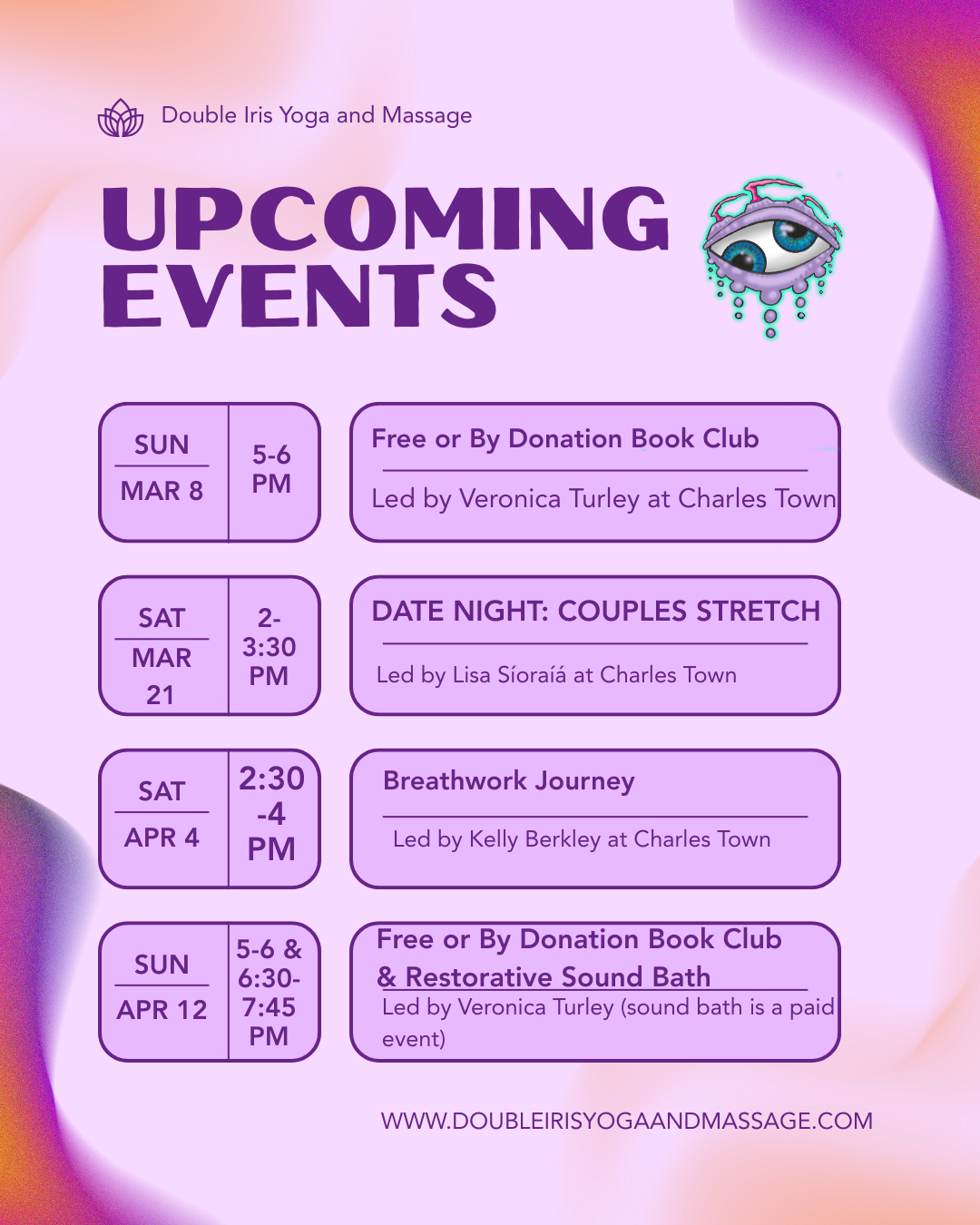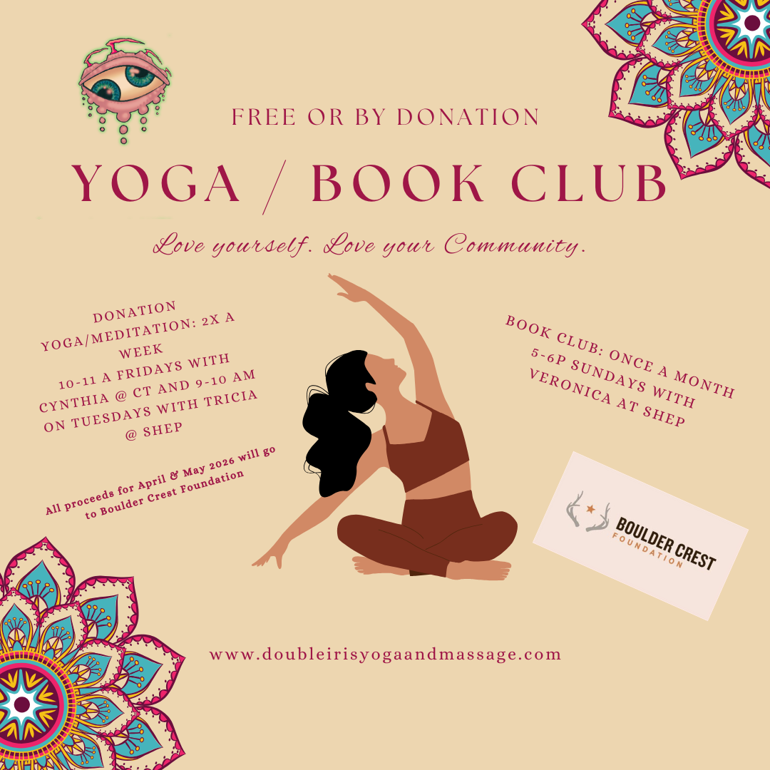 🌸 DONATION YOGA: NEW CLASSES - Please join Cynthia, every Friday, 10-11 am at the Charles Town location for Gentle Donation Yoga & Tricia every Tuesday 9-10a for free or by donation Pose Mythology & Meditation. All proceeds from January through end of March 2026 will go to CASA of the Eastern Panhandle. All proceeds from April and May will go to Boulder Crest Foundation!